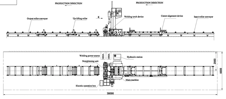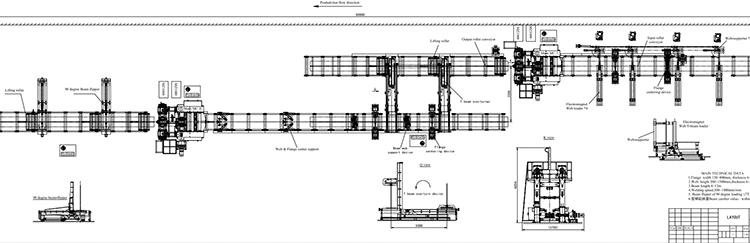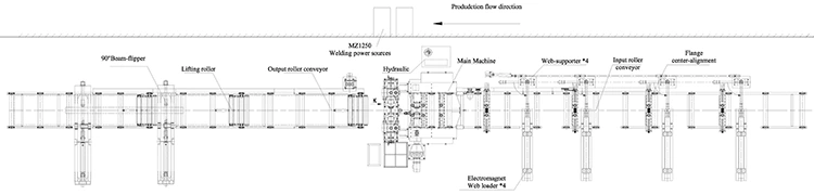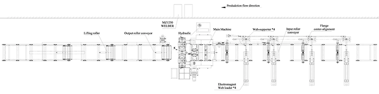 मानक ZHJ3-IN 1 H बीम वेल्डिंग लाइनों में एक इनपुट रोलर टेबल, मुख्य वेल्डिंग और स्ट्रेटनिंग स्टेशन, आउटपुट्रोलर टेबल शामिल है। मुख्य वेल्डिंग और स्ट्रेटनिंग स्टेशन पर फ्लक्स रिकवरी यूनिट्स, वेल्डिंग हेड, टार्च और क्लैम्पिंग डिवाइस के साथ वेल्डिंग हेड। वेल्डिंग पावर सोर्स, हाइड्रोलिक स्टेशन और हाइड्रॉलिक स्टेशन भी शामिल हैं।