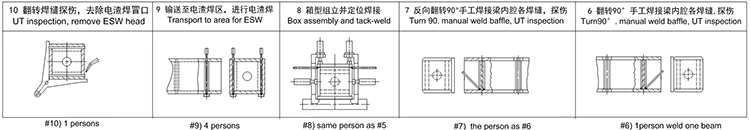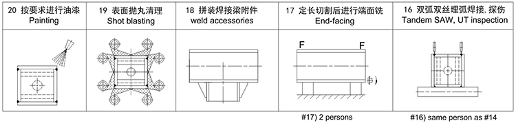 निम्नलिखित एच बीम और अंतिम निरीक्षण तक प्लेटों से उत्पादन के लिए उत्पादन प्रवाह चार्ट है।